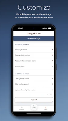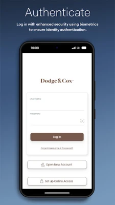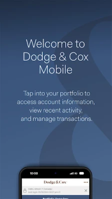 Use the same log-in credentials as your existing online account on the mobile app. If you don’t yet have online access to your Dodge & Cox account(s), you can register on the app, or visit dodgeandcox.com to create your User ID. Contact Dodge & Cox Client Service at 800-621-3979 if you need help.