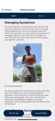 Renew Scleroderma helps people with scleroderma manage their fatigue and enhance wellbeing. It involves health coaching from trained peer mentors. Renew Scleroderma allows users to read information about scleroderma and to set and track weekly goals and complete activities relevant to these goals.