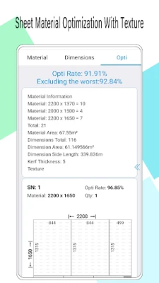 3. Sheet Cutting Optimization: Compared with glass cutting optimization , it adds the ability to set the kerf thickness yourself. This function is suitable for wood board cutting optimization , aluminum alloy plate cutting optimization , stainless steel plate cutting optimization , etc.